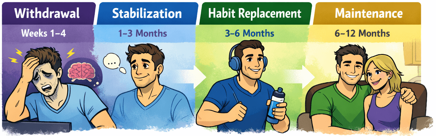 The timeline below reflects common recovery patterns observed across clinical practice, peer support communities, and behavioral research. It is meant to help you set realistic expectations—not to measure success or failure.